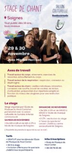 L’École de Musique du Haut Cantal, en partenariat avec la saison culturelle de Sumène Artense communauté, propose un stage de chant à Saignes les 29 et 30 novembre. Ouvert à toutes et tous dès 16 ans, ce stage s’adresse à des participants de tous niveaux, qu’ils soient débutants ou déjà familiers de la pratique vocale